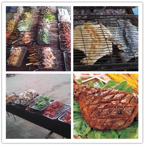 (包括羊肉串,板筋,肉筋,鸡脆骨,骨肉相连,翅中,鱼丸,鱼豆腐,肠,面筋,烤鱼,烤馒头片,烤蔬菜等,另外在烧烤期间内啤酒,饮料,矿泉水等管够)
